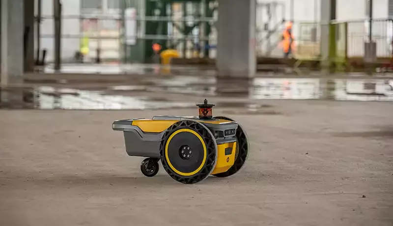 The HP SitePrint robot navigates the site automatically while printing the design layout directly onto the floor surface.